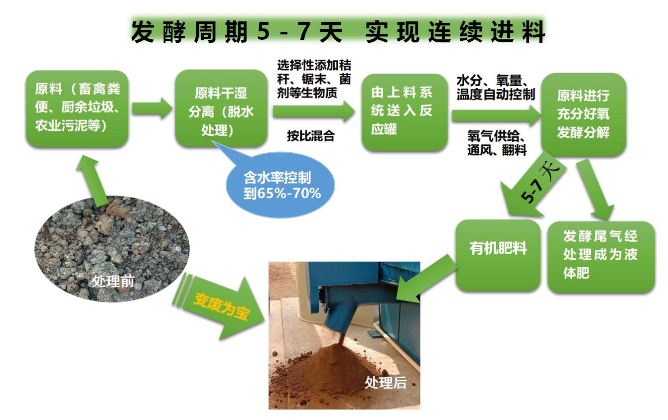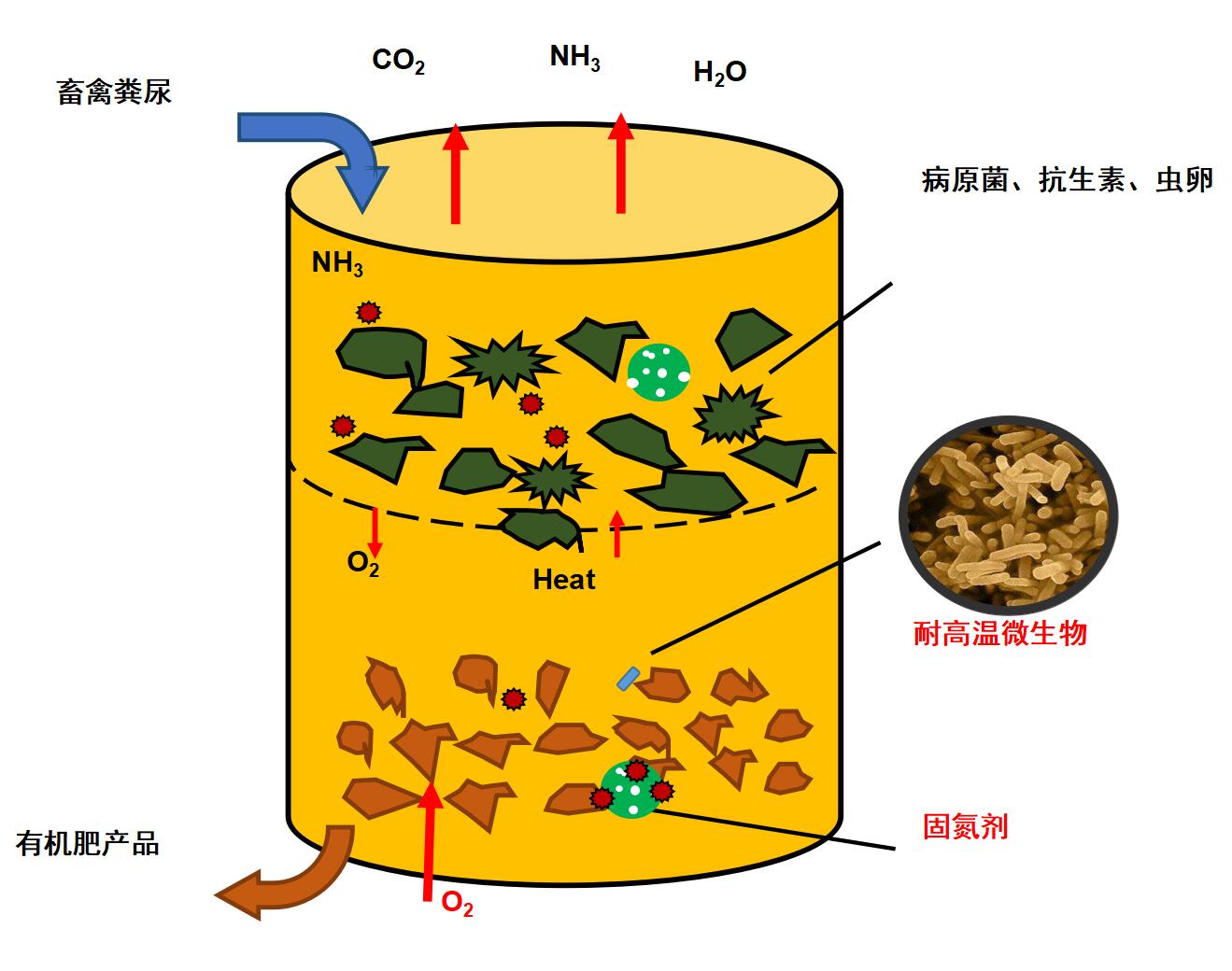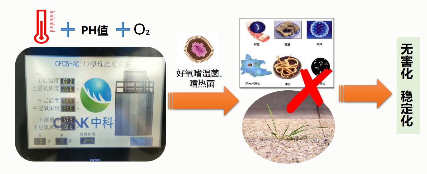 好氧堆肥發(fā)酵過程是一個微生物學(xué)處理過程,在一定溫度和PH值下,供氧通風,利用好氧嗜溫菌和嗜熱菌對其中有機物進行生化分解,降解成穩(wěn)定腐殖質(zhì)。同時,利用發(fā)酵過程中產(chǎn)生的溫度(一般達55-60℃,最高溫度可達70℃)殺死病原微生物、寄生蟲和雜草種子,以達到無害化處理指標。